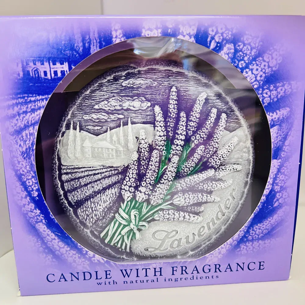 Kulatá svíčka s krásným 3D dekorem levandulového pole a nápisem Lavender.