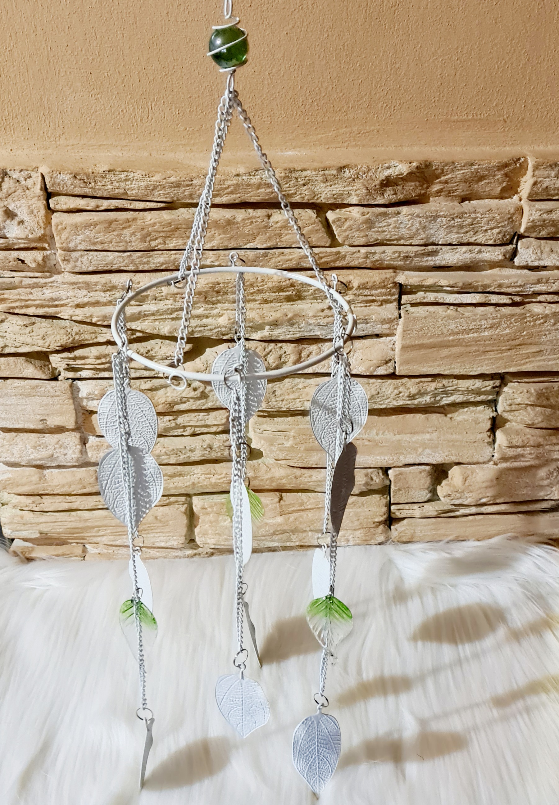 Kovová dekorace - zvonkohra bílá se zelenými listy