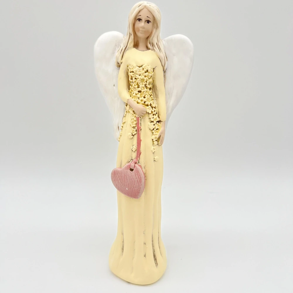 Jemná a elegantní andělka v krémově-žlutých šatech zdobených drobnými kvítky. V rukou drží růžové srdíčko – symbol lásky, péče a ochrany. Díky své výšce a detailnímu zpracování působí v interiéru velmi něžně a harmonicky.