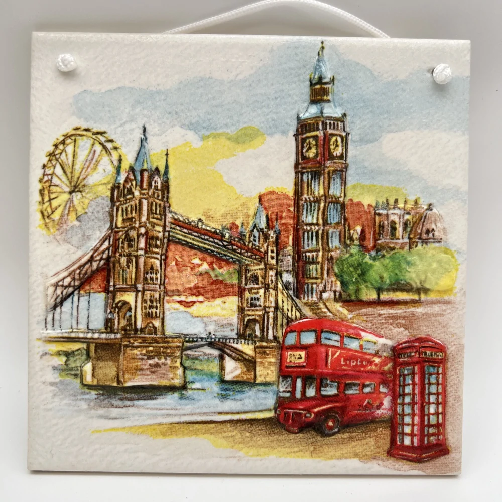 Stylová dekorace s ikonickými symboly Londýna – Tower Bridge, Big Ben, London Eye, tradiční červený doubledecker a telefonní budka. Dlaždice je zdobená technikou decoupage s jemným 3D efektem, který nádherně zvýrazňuje detaily architektury i typicky červených doplňků. ✨📞