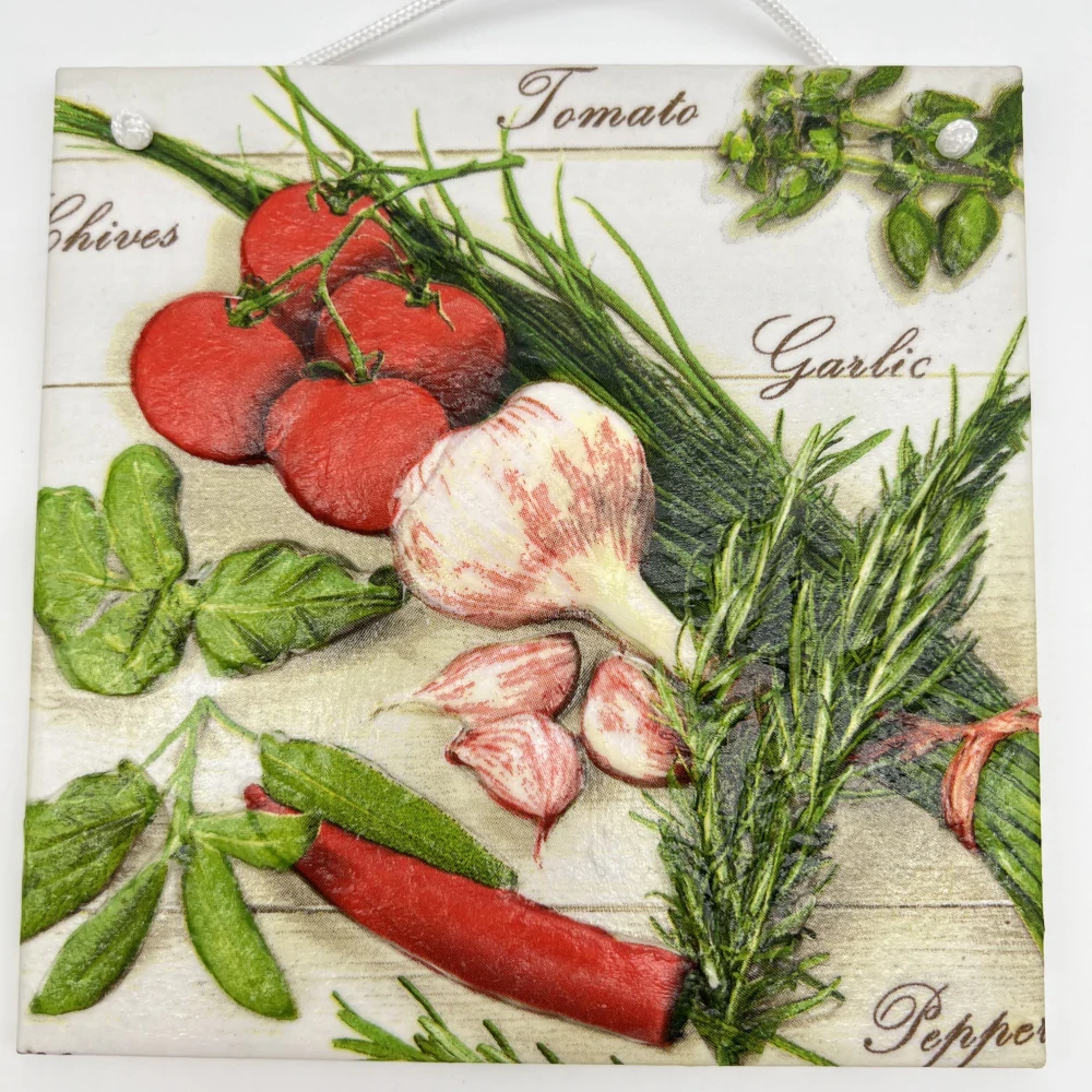 Originální dekorace do kuchyně s motivem čerstvých bylinek, česneku, rajčat a chilli papričky. Jemný rustikální podklad s anglickými názvy bylinek dodává dlaždici šarm Provence a venkova. Vyrobeno technikou decoupage s jemným 3D efektem. ✨