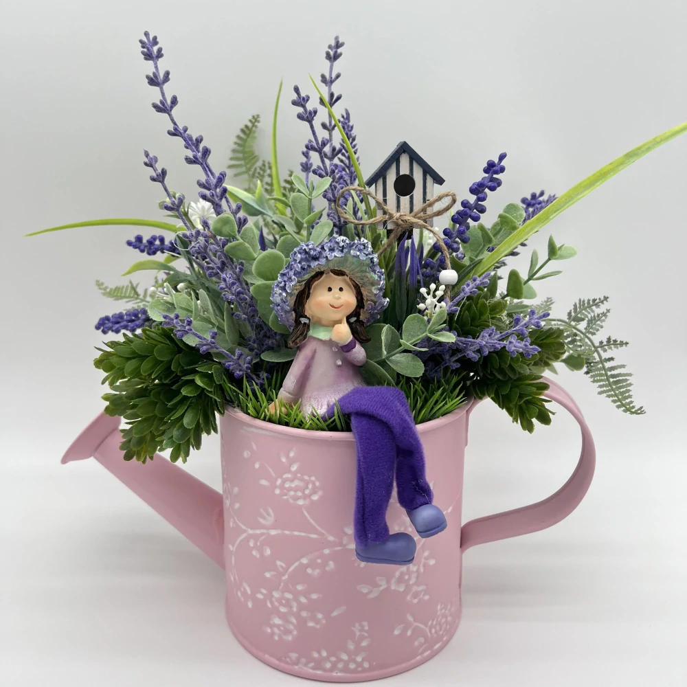 Z kovové konvičky raší fialové levandule, zelené lístky a mezi nimi sedí rozesmátá panenka s květinovým kloboučkem 👒🌿 – jako by si právě užívala slunečný den na venkově 🌞🪻