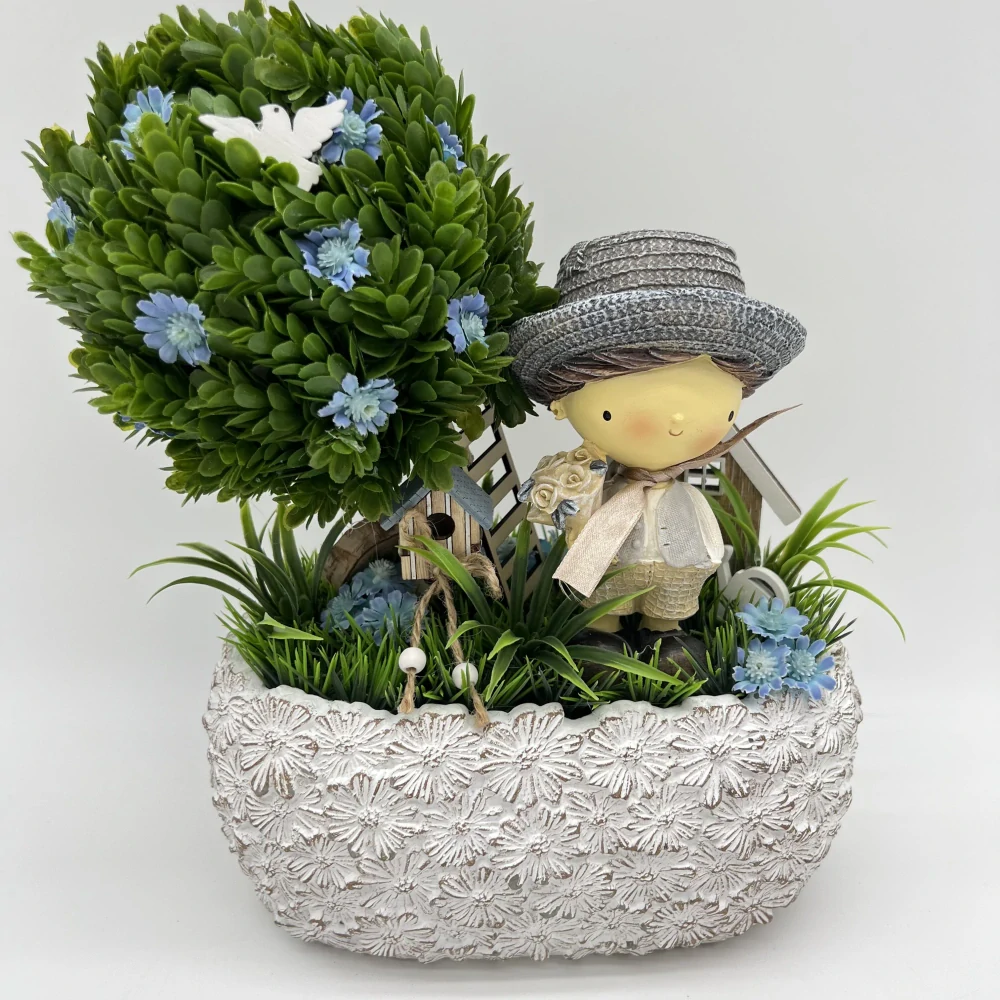 Krásná dekorace v betonovém obalu doplněná bohatou zelení, jemnými modrými kvítky a roztomilou figurkou chlapečka. Celé aranžmá doplňují drobné dřevěné detaily a přírodní prvky, které vytvářejí útulnou dekoraci. ✨