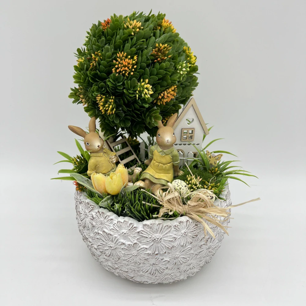 Roztomilá dekorace s dvojicí zajíčků, domečkem a bohatou zelení vytváří kouzelnou scénu připomínající malou zahrádku. Dominantou aranžmá je dekorativní stromek doplněný jemnými detaily, vajíčky a dřevěnými ozdobami. 🤍