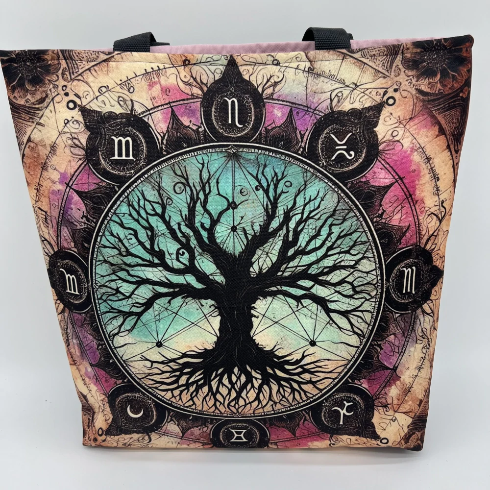 Nádherně barevná a mystická taška se Stromem života obklopeným znameními zvěrokruhu v růžovo-tyrkysovém ladění okouzlí na první pohled ✨. Spojuje originální design, symboliku a maximální praktičnost pro každý den.