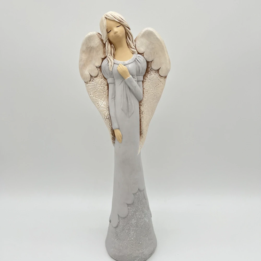 Nádherná, jemně působící andělka s dlouhými šedými šaty a decentně zdobenými křídly v perleťových tónech. Hlavu má lehce skloněnou, ruku položenou na srdci – jako symbol ochrany, víry, klidu a vděčnosti. Díky své výšce je opravdu výrazným a luxusním doplňkem interiéru.