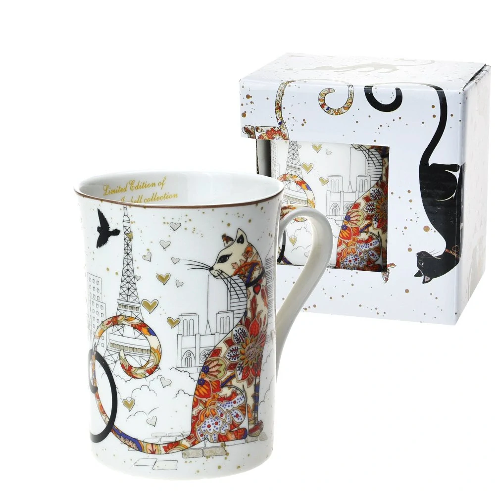 Stylový porcelánový hrnek s jemnou a romantickou dekorací koček v Paříži. Elegantní provedení se zlatými detaily a uměleckým motivem potěší každého milovníka koček i krásných věcí 💛