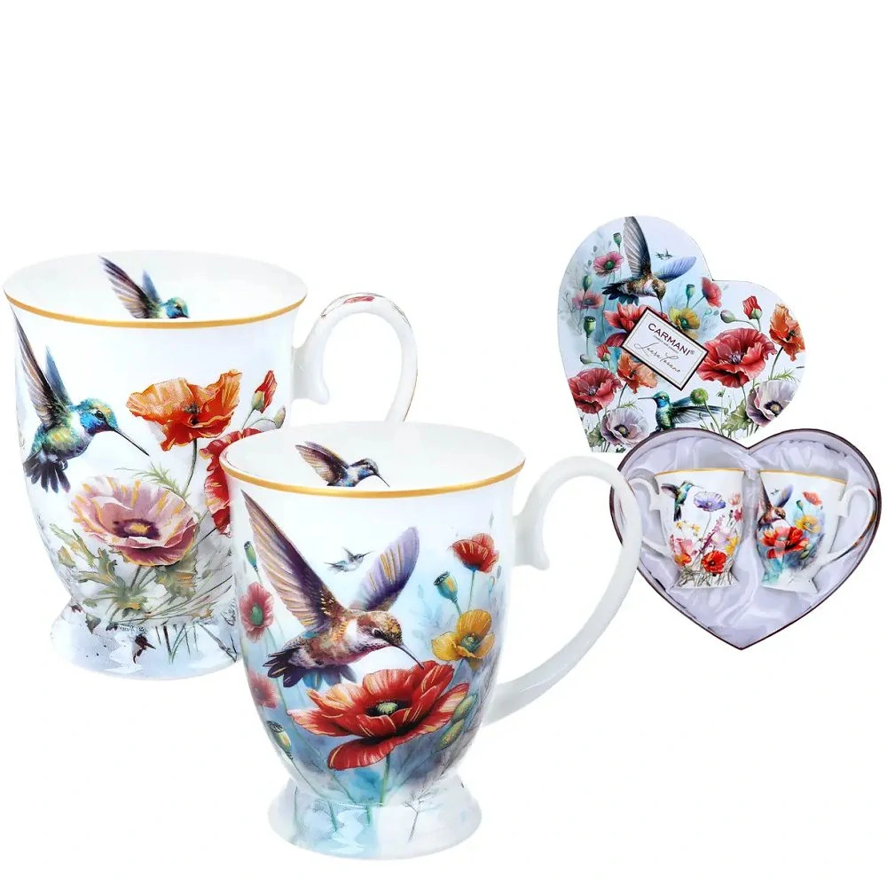 Nádherná dárková sada dvou hrníčků z kvalitního porcelánu značky Carmani® z kolekce Laury Lozano. Jemný motiv kolibříků mezi květy působí lehce, romanticky a velmi elegantně 🌺✨