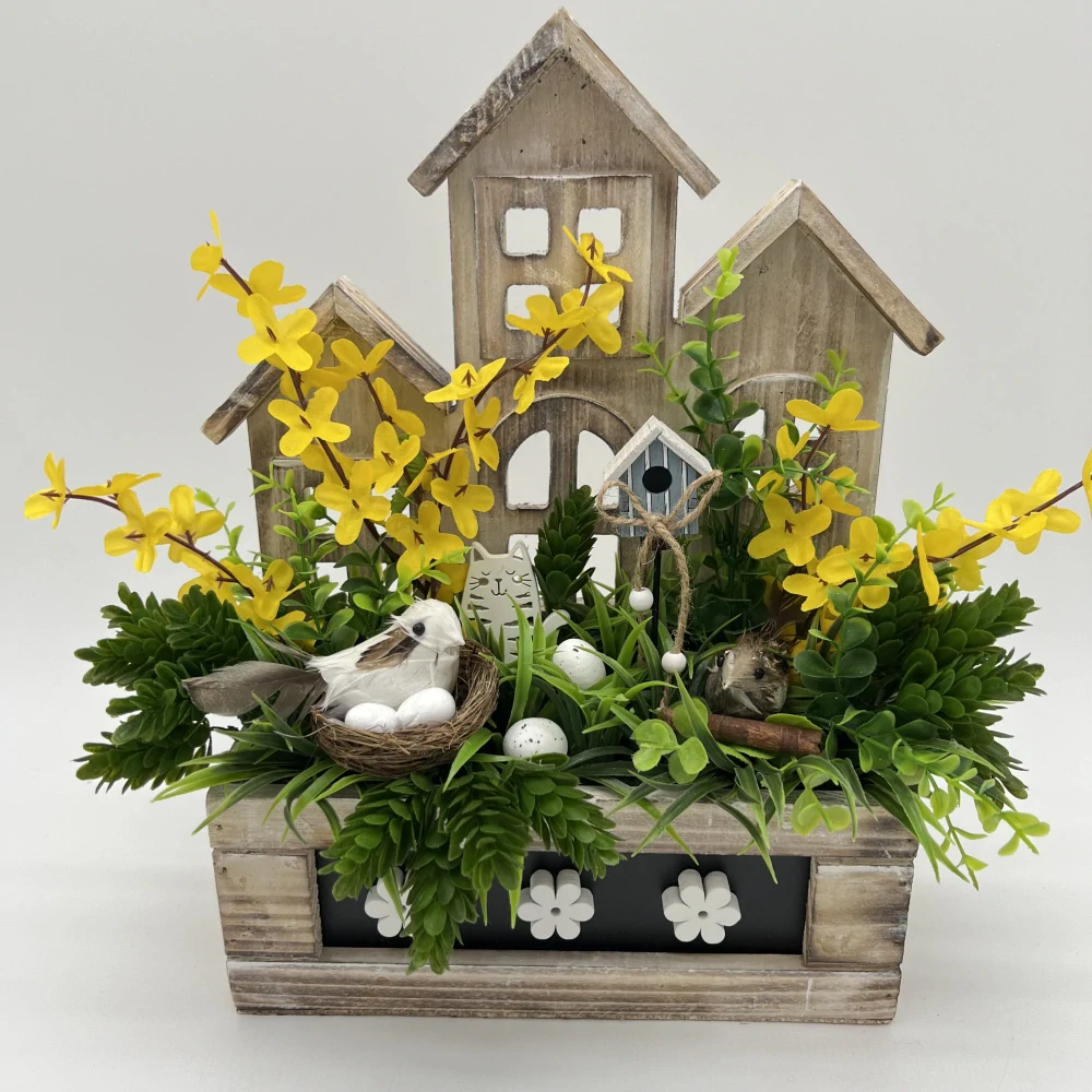Kouzelná jarní dekorace ve tvaru dřevěných domečků, která připomíná malou rozkvetlou zahrádku. Aranžmá je doplněno svěží zelení, žlutými jarními květy a milými detaily – hnízdečkem s ptáčkem, ptačí budkou a drobnými vajíčky.