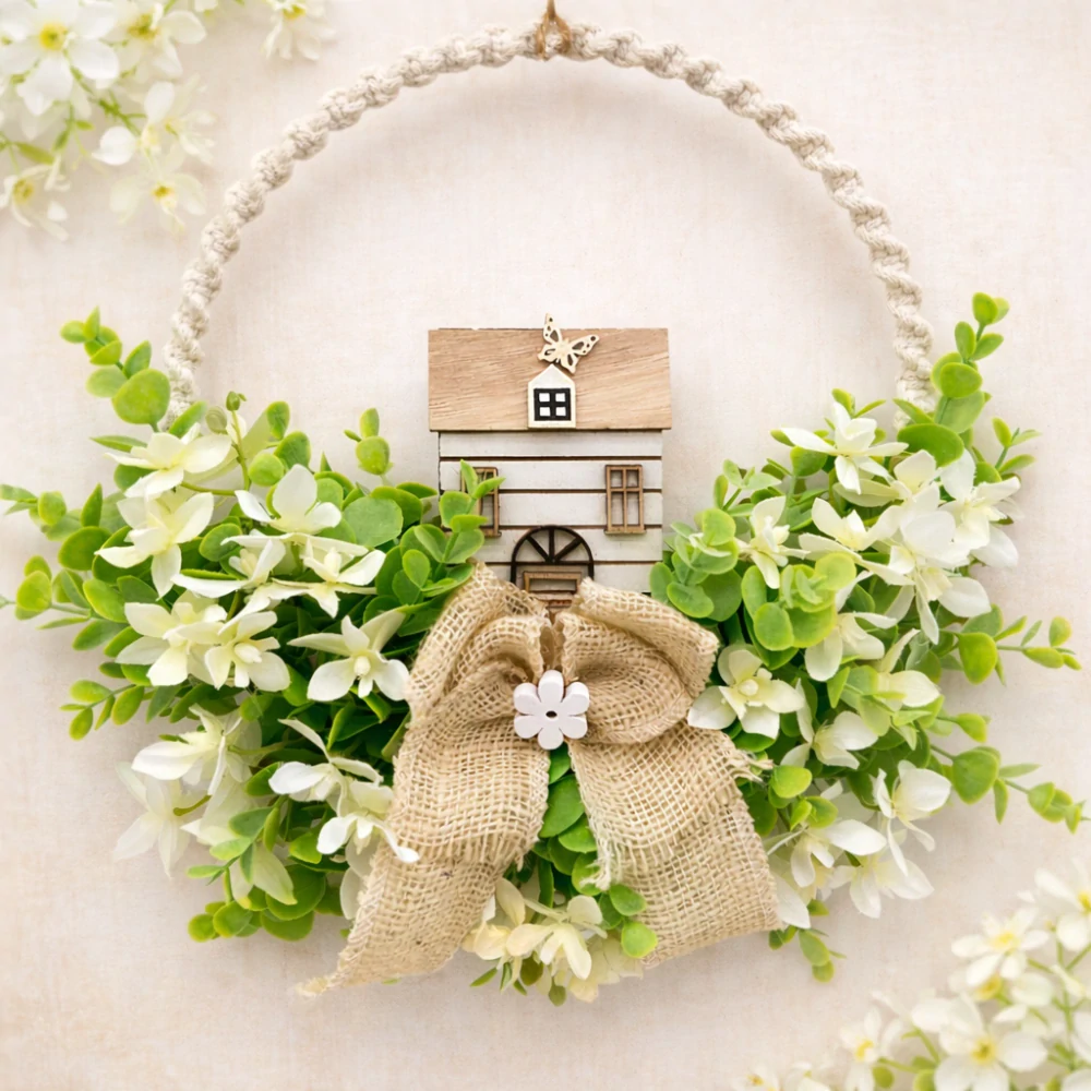 Jemný a svěží jarní věnec, který vnese do vašeho domova pocit pohody a útulnosti. Dominantou je dřevěný domeček doplněný bohatou zelení a drobnými kvítky v přírodním stylu. Nechybí ani jutová mašle, která dodává věnci rustikální kouzlo.