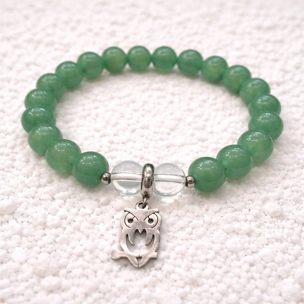 Jemný a harmonický náramek z přírodního avanturinu v krásné zelené barvě, doplněný o čirý křišťál a stylovou sovičku z chirurgické oceli ✨