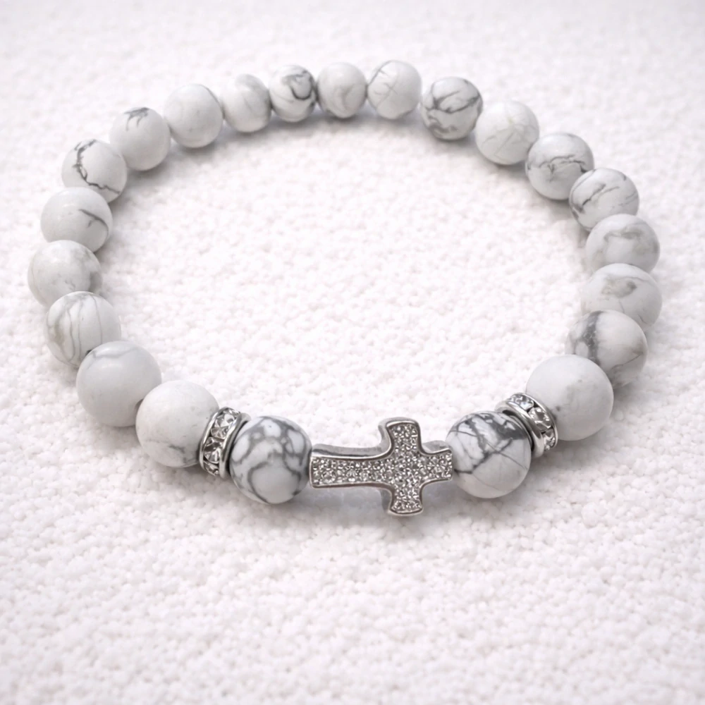 Jemný a elegantní náramek z přírodního kamene howlit mat v bílé barvě s typickým šedým žilkováním, doplněný o decentní křížek se zirkony ✨
