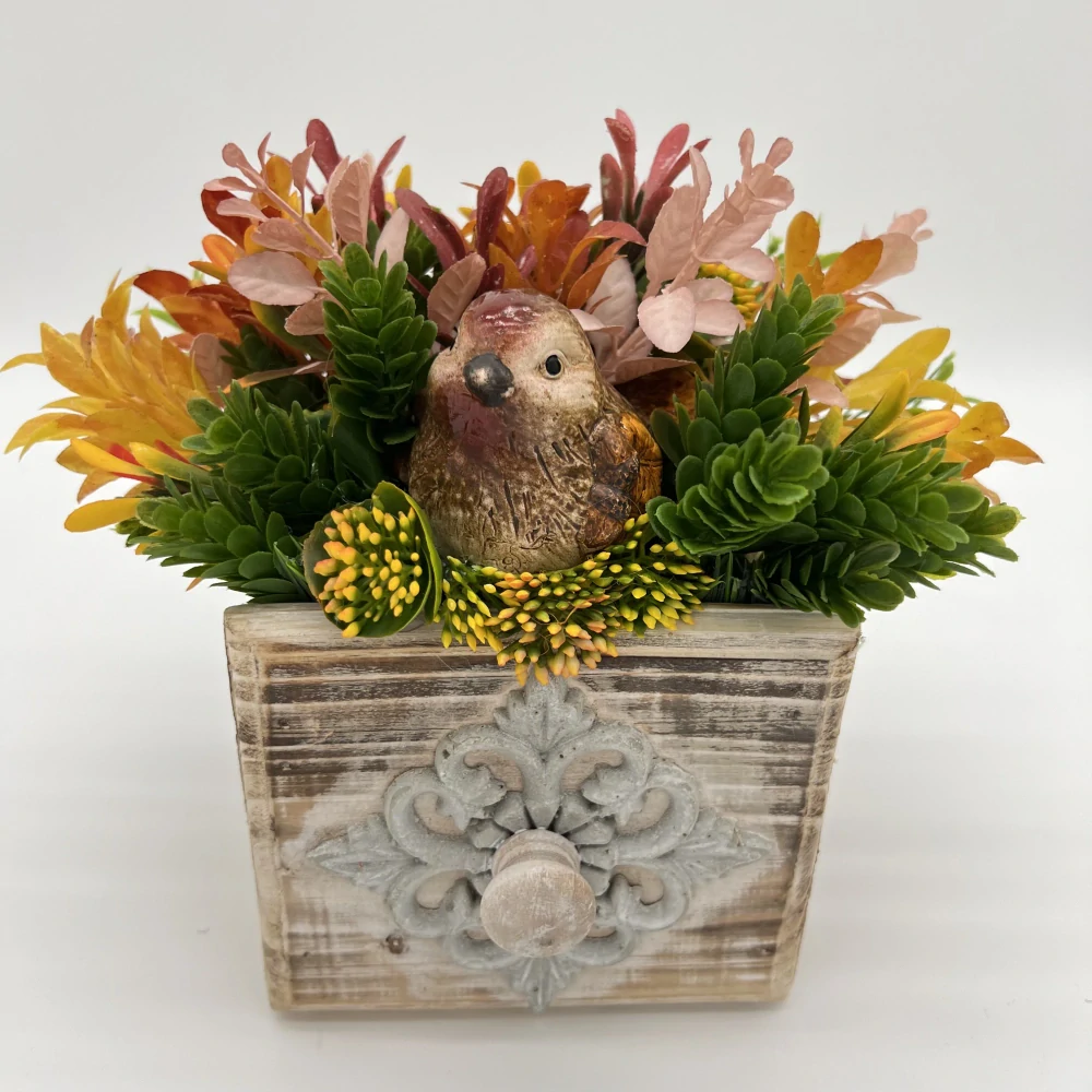 Rustikální dřevěný truhlíček s plastickým zdobením na čele ukrývá veselou dekoraci, která rozzáří každý domov. Uvnitř je roztomilý keramický ptáček obklopený barevnými umělými květinami a zelení v podzimních tónech.