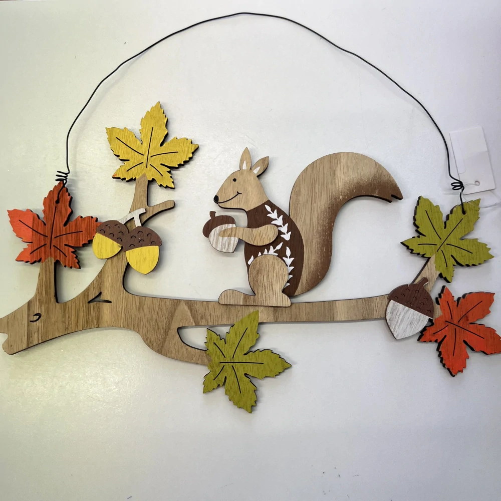 Roztomilá dřevěná závěsná dekorace s veverkou, která si pochutnává na oříšku. Dekor je doplněný o barevné listy a žaludy v typických podzimních barvách.