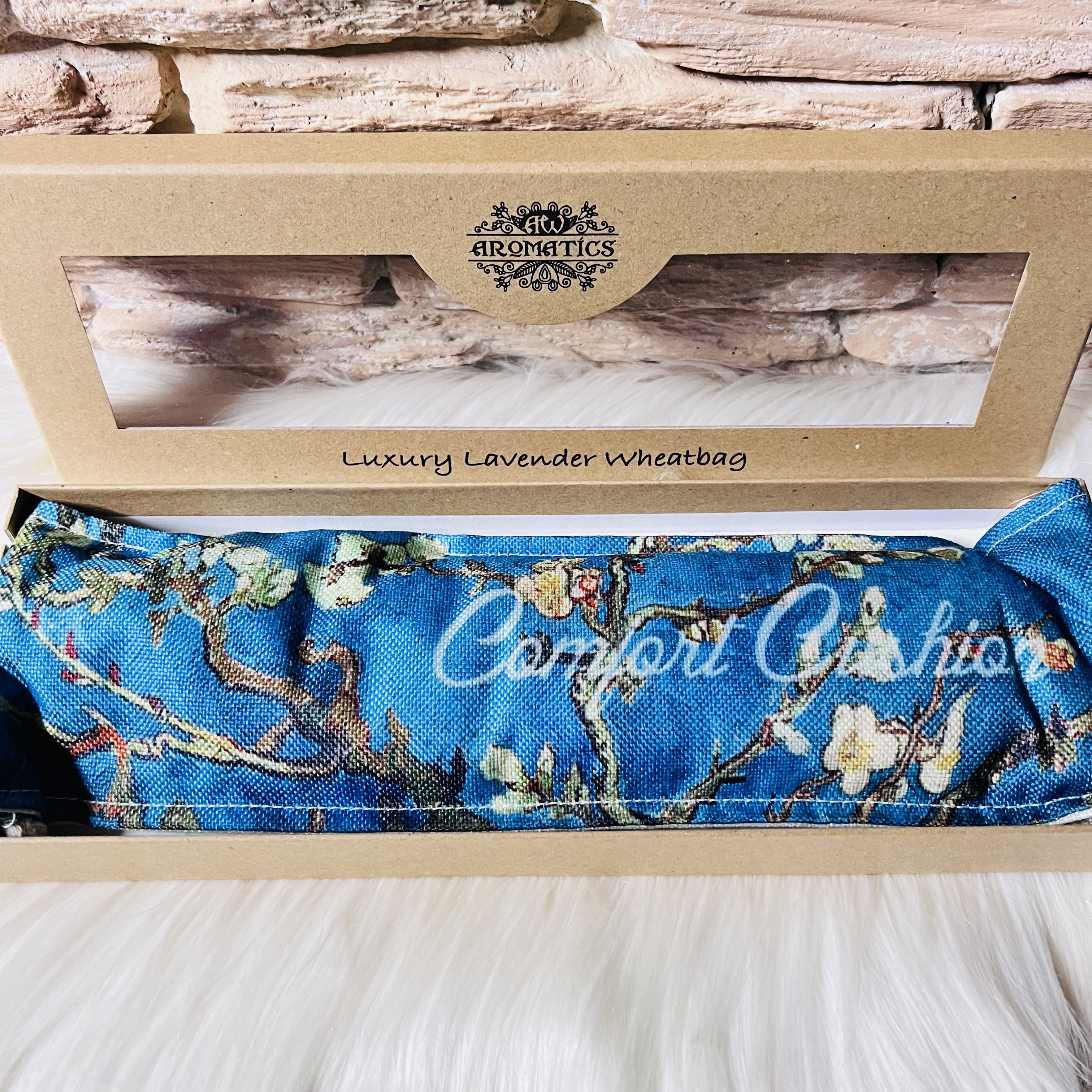 Tyto luxusní levandulově - pšeničné polštáře jsou baleny v dárkových krabicích. Všimněte si, jak rukojetě ční z krabice a tvoří zajímavý design.