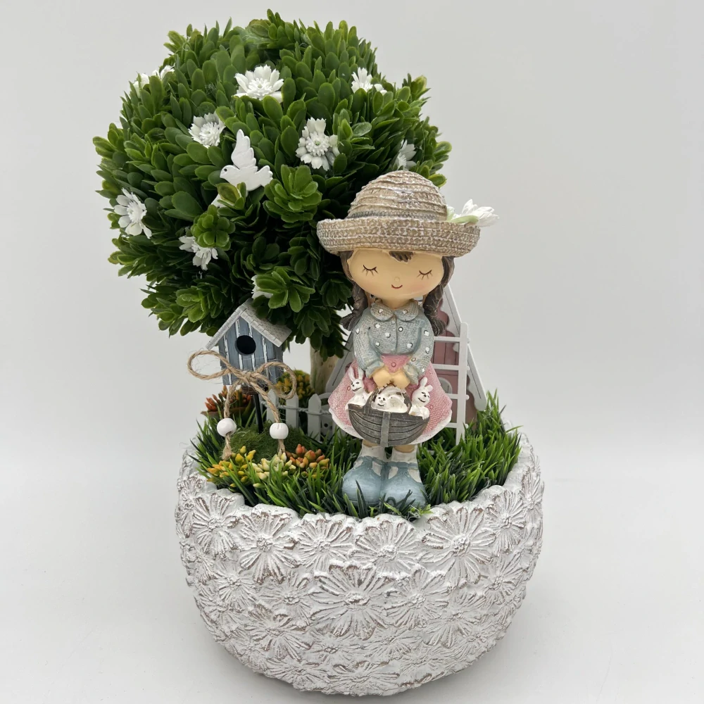 Roztomilá dekorace s figurkou holčičky držící košíček s králíčky. Aranžmá je doplněno bohatou zelení, drobnými kvítky a dřevěnými detaily, které vytvářejí jemnou a útulnou dekoraci. 🤍