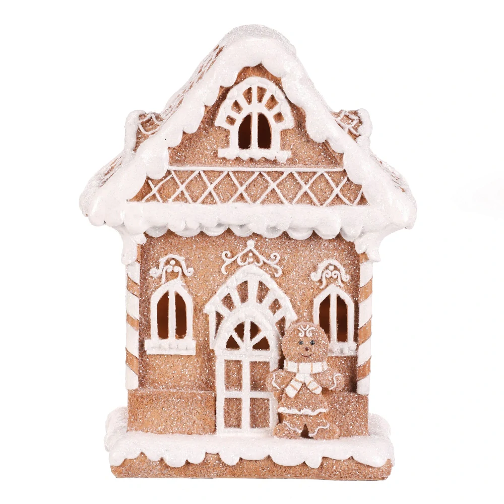 Velký perníkový domeček z polyresinu s roztomilým perníčkovým panáčkem u dveří. Detailní hnědo-bílé zdobení připomíná ručně malovanou cukrovou polevu a LED osvětlení krásně rozzáří okénka i celý domeček. Jemný třpyt dodává dekoraci kouzelnou sváteční atmosféru.