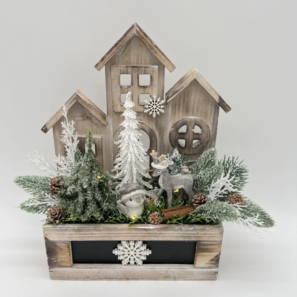 Truhlík je zdobený domečky, sobíkem, zasněženými stromky a drobnými detaily, které dodávají celé scéně hřejivý vánoční půvab. Ideální na stůl, polici či parapet. 🤍