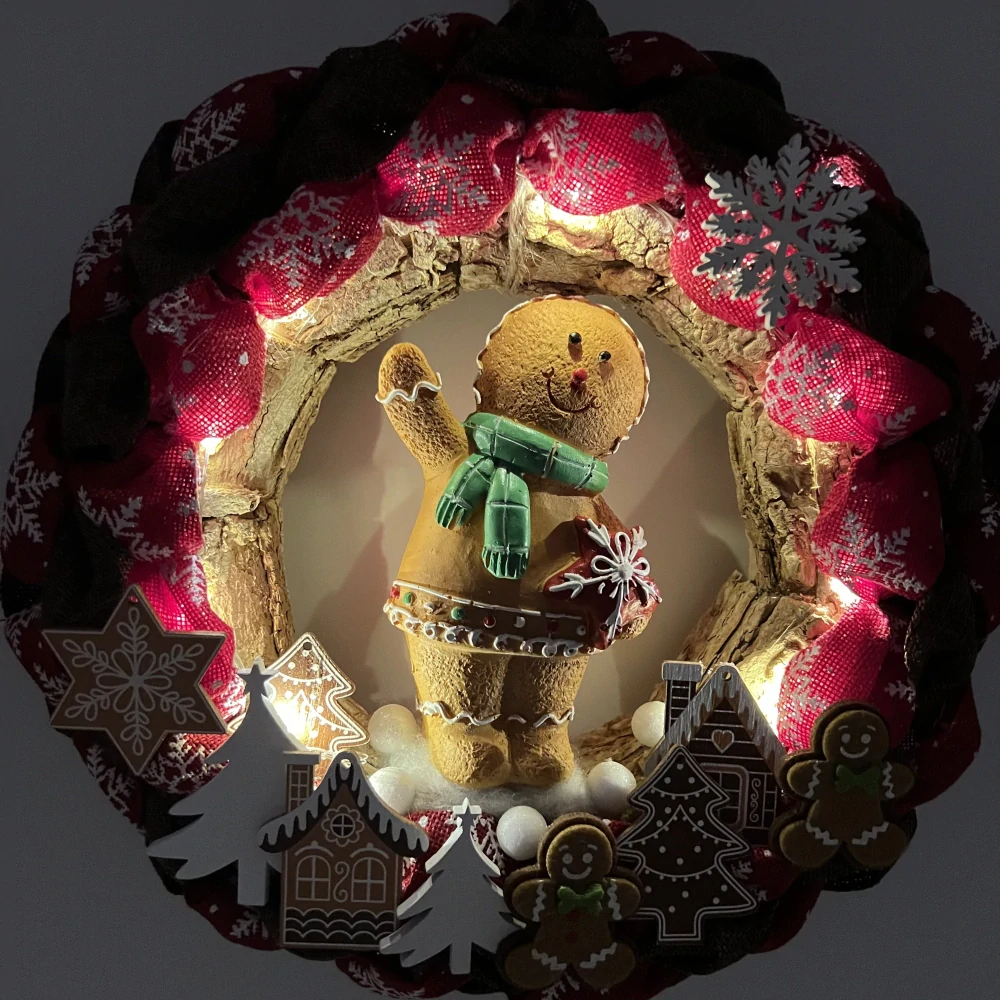 ZIMNÍ DEKORACE VĚNEČEK NA DVEŘE S FIGURKOU A OSVĚTLENÍM